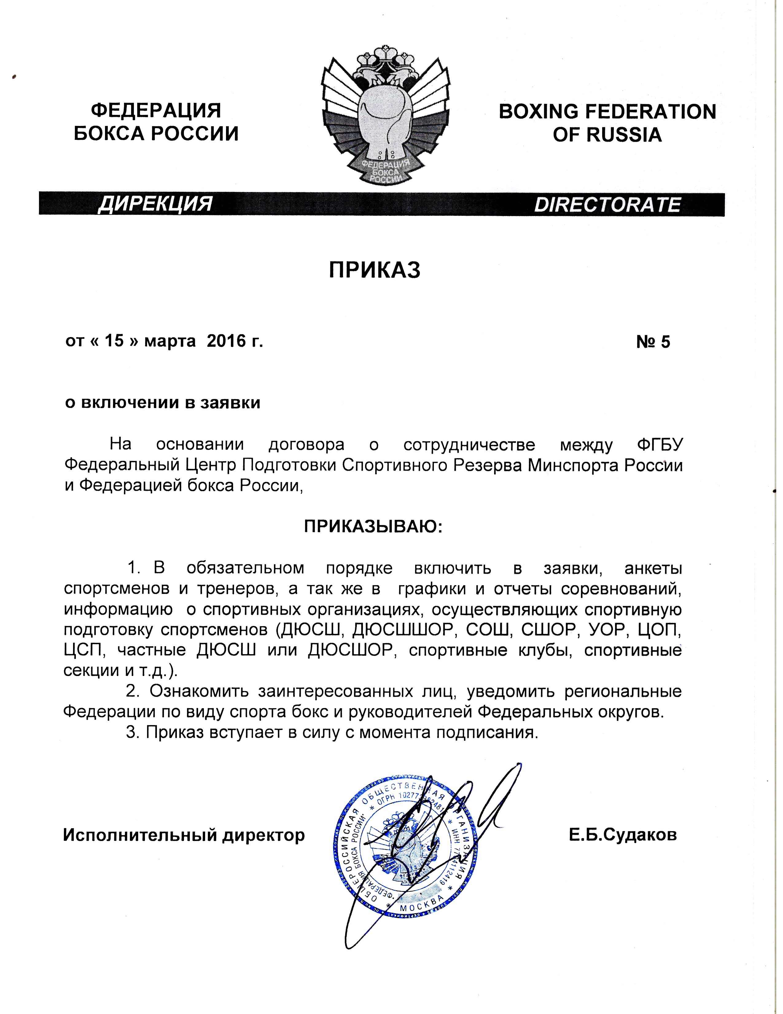 Приказ Федерации бокса России о включении в заявки информации о спортивных организациях, осуществляющих подготовку спортсменов