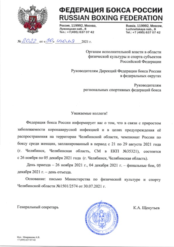 Чемпионат России по боксу среди женщин, который должен был пройти в Челябинске в конце августа 2021 года, перенесен на ноябрь. Такое решение приняла Федерация бокса России совместно с организационным комитетом, созданным в Челябинской области.