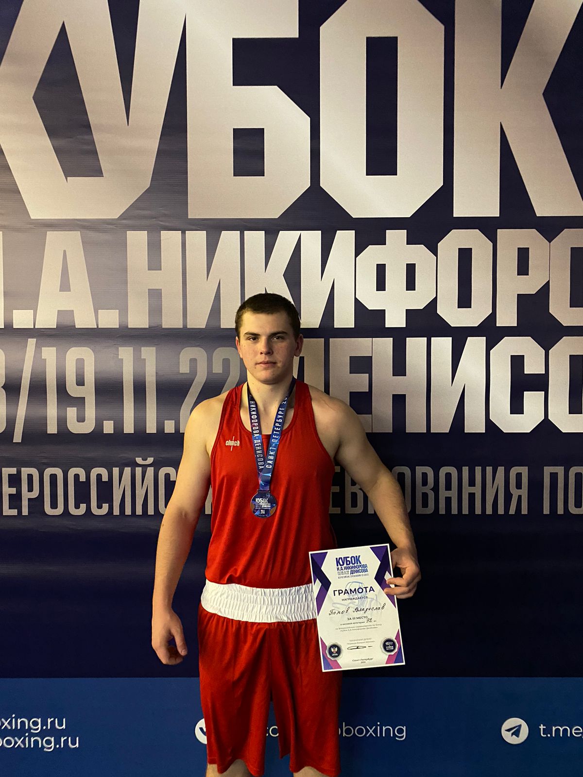 21.11.2022 В период с 12 по 20 ноября 2022 года в г. Санкт-Петербург проходили всероссийские соревнования "Кубок Никифорова-Денисова" памяти Почетного Президента АИБА среди юниоров. Спортивную сборную команду Ставропольского края представляли 5 боксеров. В весовой категории 92 кг Попов Владислав стал бронзовым призером соревнований. По итогам турнира будет сформирована сборная команда страны для участия в первенстве Европы 2023 года.